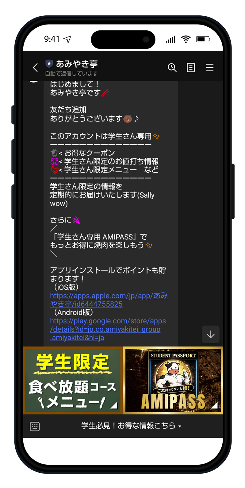 学生限定コースを楽しんであみやき亭パスポート